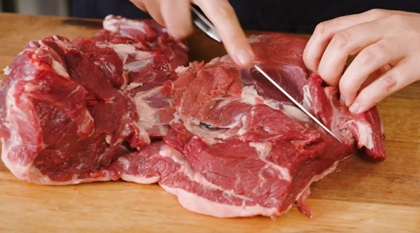 There are a few different ways you can do this, but I'm going to show you how I like to do it. There’s a bone that runs from the knuckle all the way down to the shank. So, we'll start with a knife starting at the knuckle, working our way down to where we reach the knee and as you cut down, you'll feel the bone underneath just using the tip of your knife.